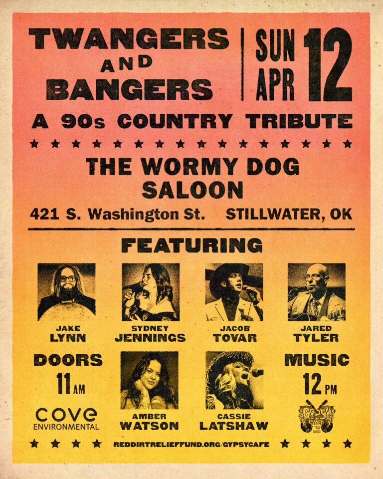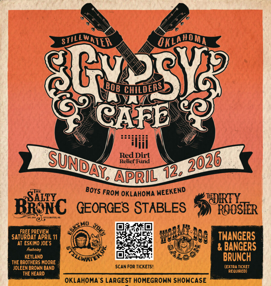 Bob Childers’ Gypsy Café, Oklahoma’s largest homegrown songwriter festival, announces its 2026 date will be Sunday, April 12th, the day following the Boys from Oklahoma concert at Boone Pickens Stadium in Stillwater, Okla. More than 60 Oklahoma songwriters will play 45-minute acoustic song swap sets staggered across five local music venue stages.